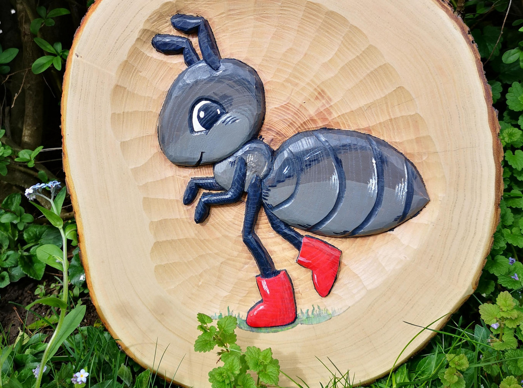 Mravljica je izrezbarjena iz jesenonevega ali brezovega lesa, pobarvana z akrilnimi barvami in UV impregnirana.